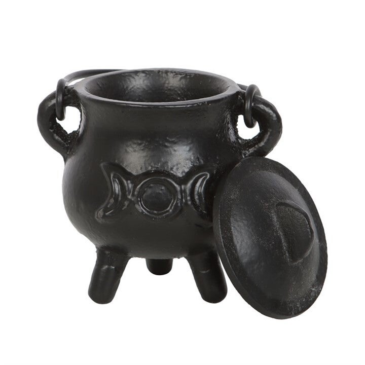 A small sized cast iron cauldron with triple moon design in a smooth finish. Add to an altar space for use during rituals and spell work. Also perfect for making moon water, scrying, combining herbs and more. Measures 7.5cm tall, not including handle. Not suitable for use with tall candles or food items. Caution: cauldron will get hot when used with a heat source. Please handle with care and always place on a heat resistant surface.